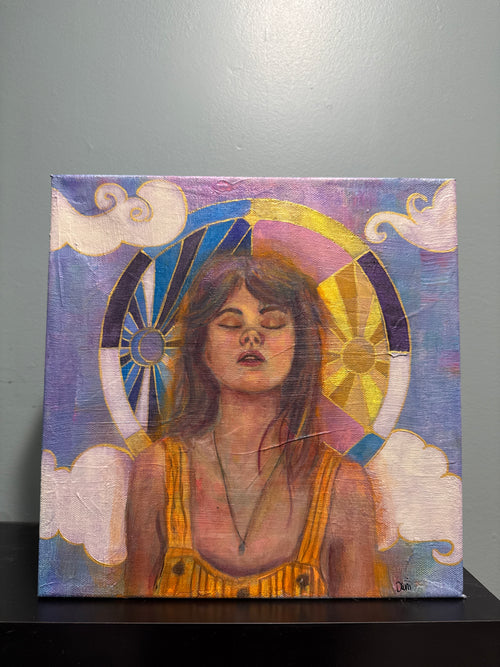 A quieter power lives here. Alignment explores stillness, inner clarity, and the moment everything finally clicks into place—not because the world changed, but because you did. The circular halo-like structure and symbolic elements anchor the composition, while warm golds and soft violets create a sense of balance between grounded reality and something more expansive. Eyes closed, shoulders relaxed—this isn’t escape, it’s integration. This piece represents the version of you that no longer needs to chase—because you’ve already arrived where you’re meant to be.