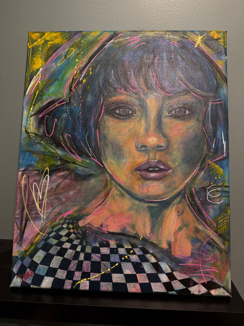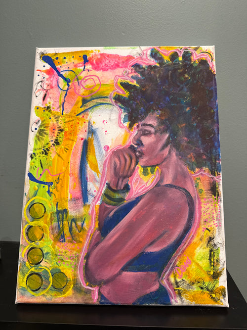 A study in tension, presence, and the quiet demand to be seen. Too Much to Ignore pulls the viewer into a saturated emotional space where softness and intensity coexist. The figure leans forward, not in submission, but in confrontation—caught between vulnerability and control. Layers of pink, red, and subtle neon undertones create a charged atmosphere, while the expressive brushwork keeps the piece alive and slightly unresolved, like a thought you can’t quite shake. This piece lives in that moment when you realize shrinking yourself isn’t working anymore.